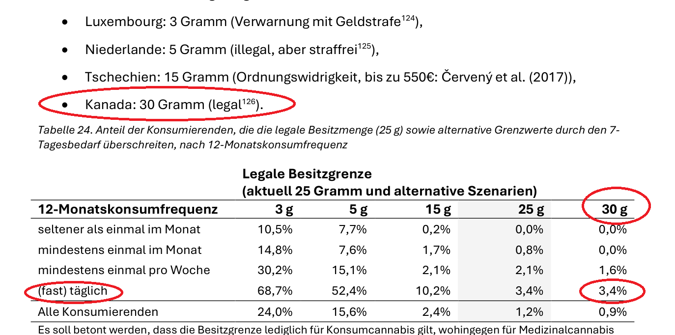 <Drei Viertel (75%) der berichteten Anbaumengen lagen zwischen 32 und 100 Gramm, wobei 41,6% die legale Grenze von 50 Gramm überschritten. Dieser Anteil variiert mit der Konsumhäufigkeit, wobei mit zunehmender Konsumhäufigkeit mehr Personen die legale Grenze überschreiten. Da im EKOCAN-Survey täglich konsumierende Menschen überrepräsentiert sind, stellen die 41,6% vermutlich eine Überschätzung der Realität dar. Werden auch hier die Anteile nach der Konsumhäufigkeit an die geschätzte Populationsverteilung angepasst (s. Tabelle 4), überschreiten noch 31,9% die legale Grenze von 50 Gramm.